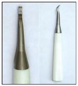 Đúng như tên gọi, dụng cụ đẩy band (Hình 4) được sử dụng để đẩy band nhằm đặt band vào vị trí và/hoặc thích nghi band theo đúng đường viền giải phẫu của răng. Tay cầm dạng rỗng, được tạo hình giải phẫu giúp dụng cụ nhẹ, trong khi đầu tip hình chữ nhật có rãnh nhám giúp truyền lực tốt khi đặt band.