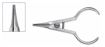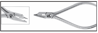 Như tên gọi, kìm gỡ mắc cài (Hình 27) được dùng để tháo mắc cài dán dính. Đầu mỏ chêm vào giữa cạnh đế mắc cài và bề mặt răng, giúp nhấc mắc cài ra dễ dàng. Có hai dạng: thẳng (dùng cho vùng răng trước) và mỏ cong 60° (giúp tiếp cận tốt hơn ở vùng răng sau).